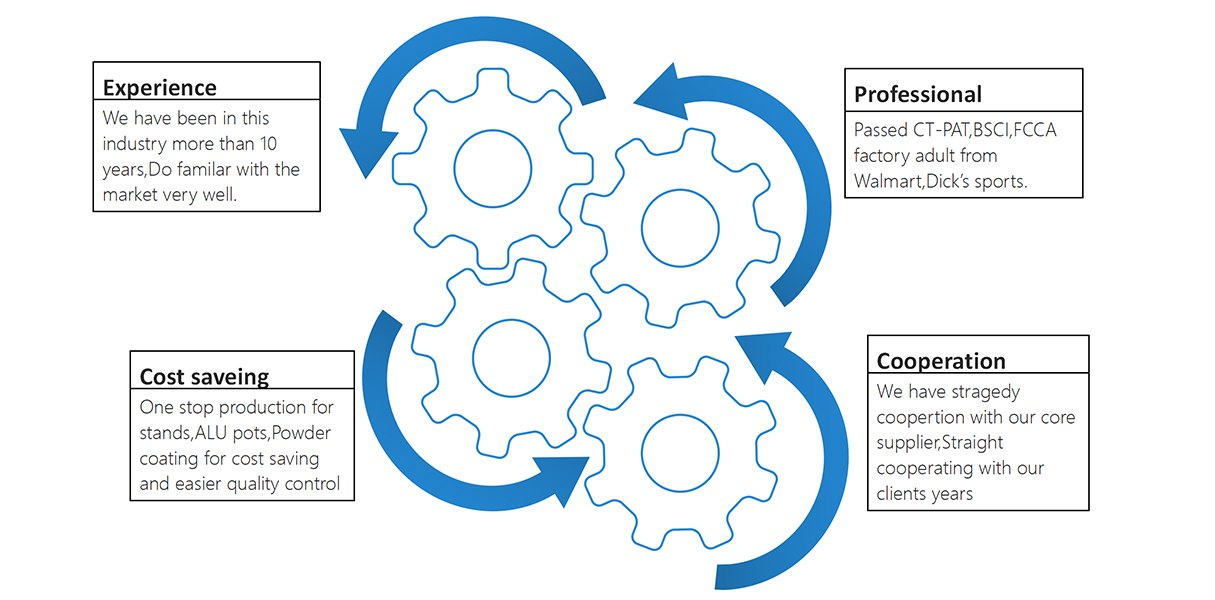 Established in 2013,Jake outdoor has become a leading outdoor propane manufacturer in China,We have our own metal worshop in producing the stands,Aluminium workshop in making the pots,And our own powder coating in cost safety and better quality control.